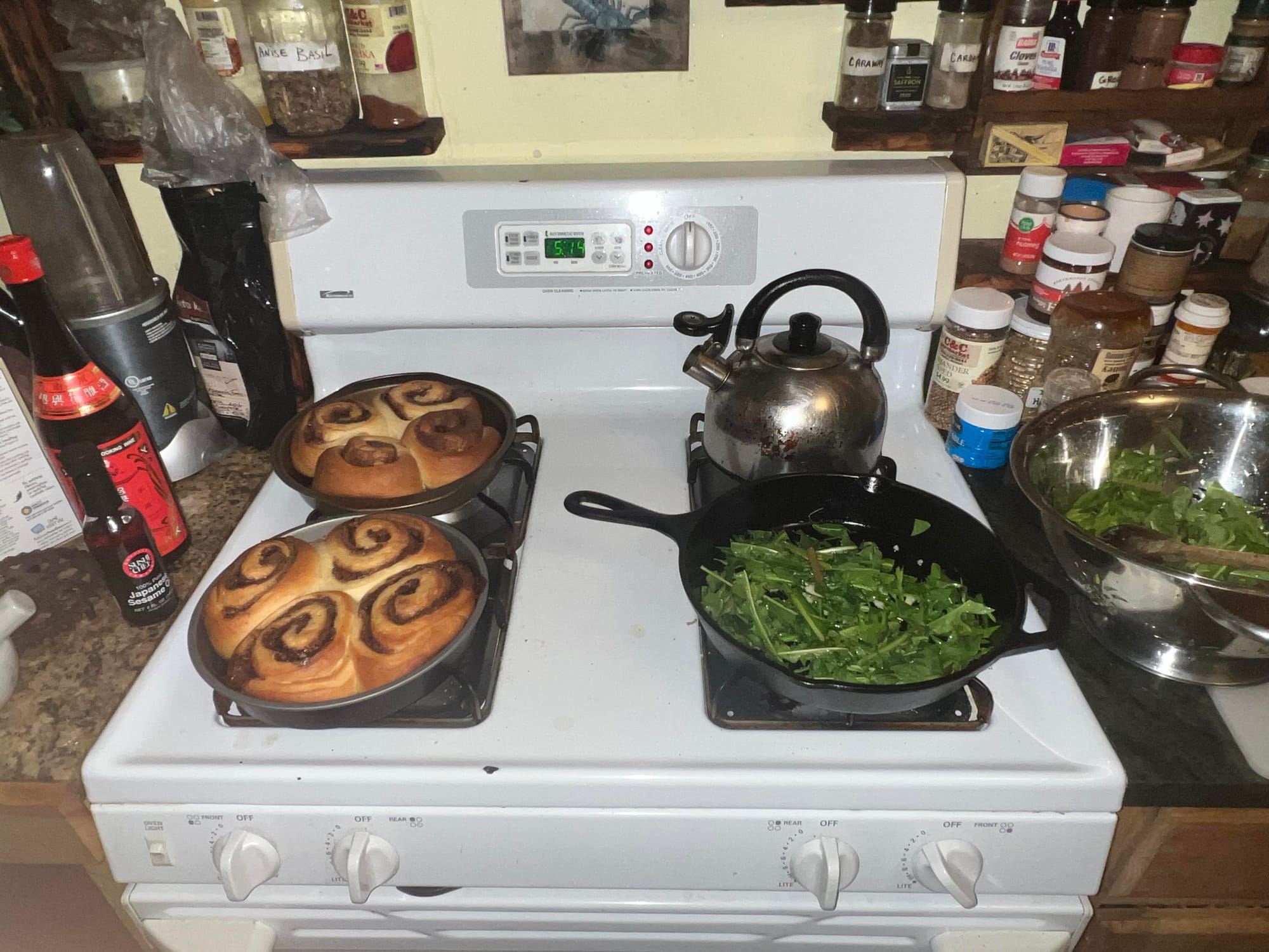 I prepared a simple sautée of chopped Dandelion leaves with butter, garlic, red pepper, and salt. The end result reminded me of 空心菜, stir fried water spinach. Earlier in the day, Ocea and I had baked cinnamon buns, and I took great pleasure in my bittersweet dinner of cinnamon buns and Dandelion greens. Questionable nutritional balance but unquestionable poetry.